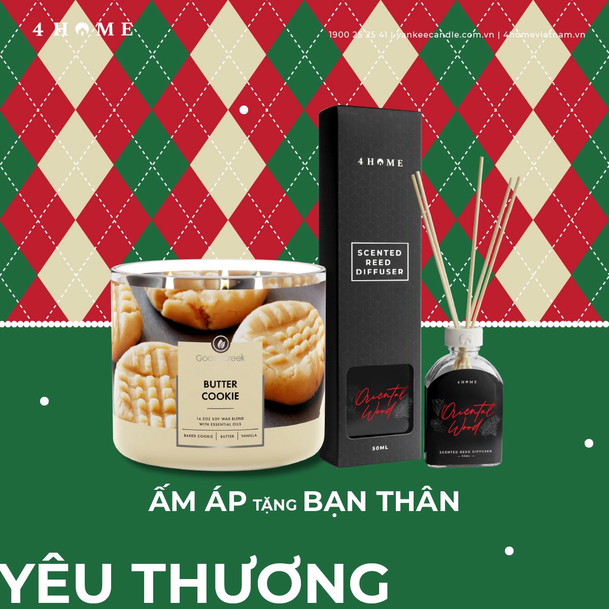 Hộp quà với nến ly Goose Creek Butter Cookie thơm mùi bánh quy bơ nướng, kết hợp que tán hương Oriental Wood sang trọng – là món quà thay lời nhắn gửi: “Mong năm mới của bạn đầy ắp ngọt lành và niềm vui nhỏ bé.”