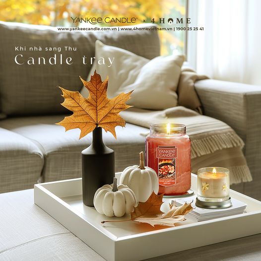 Mùa thu đến mang theo không khí dịu dàng và mát mẻ. Đây cũng là thời điểm lý tưởng để thay áo mới cho ngôi nhà. Không cần quá cầu kỳ hay phức tạp, một set candle tray với nến thơm Crisp Camfire Apples, một lọ hoa thả chiếc lá phong, đặt thêm vài quả bí ngô nhỏ xinh bên cạnh.