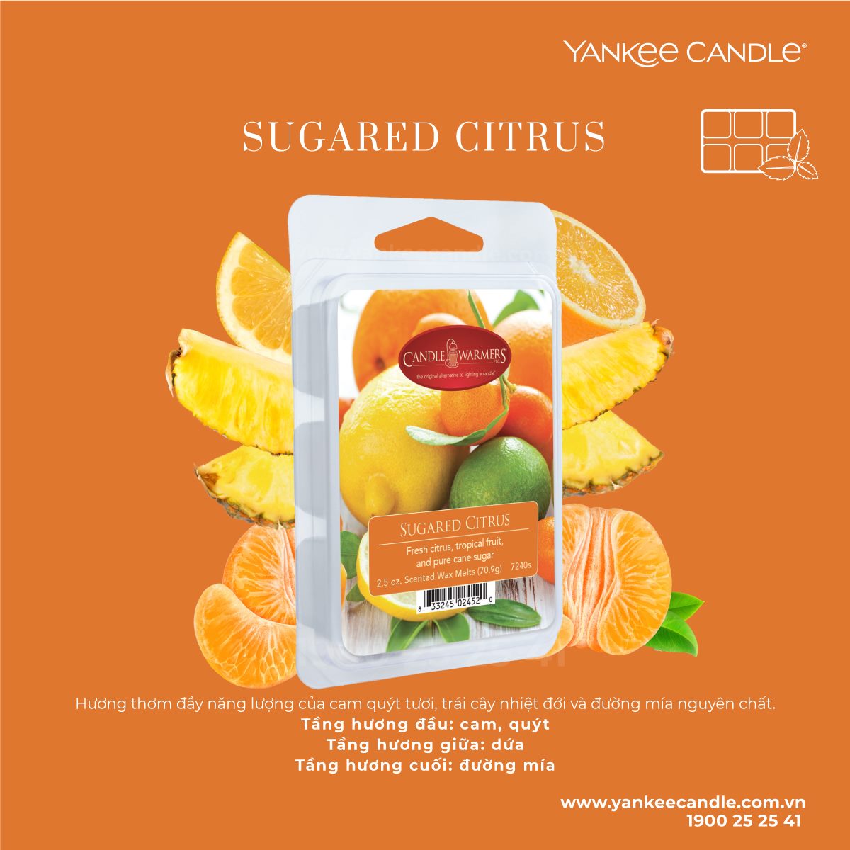 Sugared Citrus: Hương thơm đầy năng lượng của cam quýt tươi, trái cây nhiệt đới và đường mía nguyên chất.
