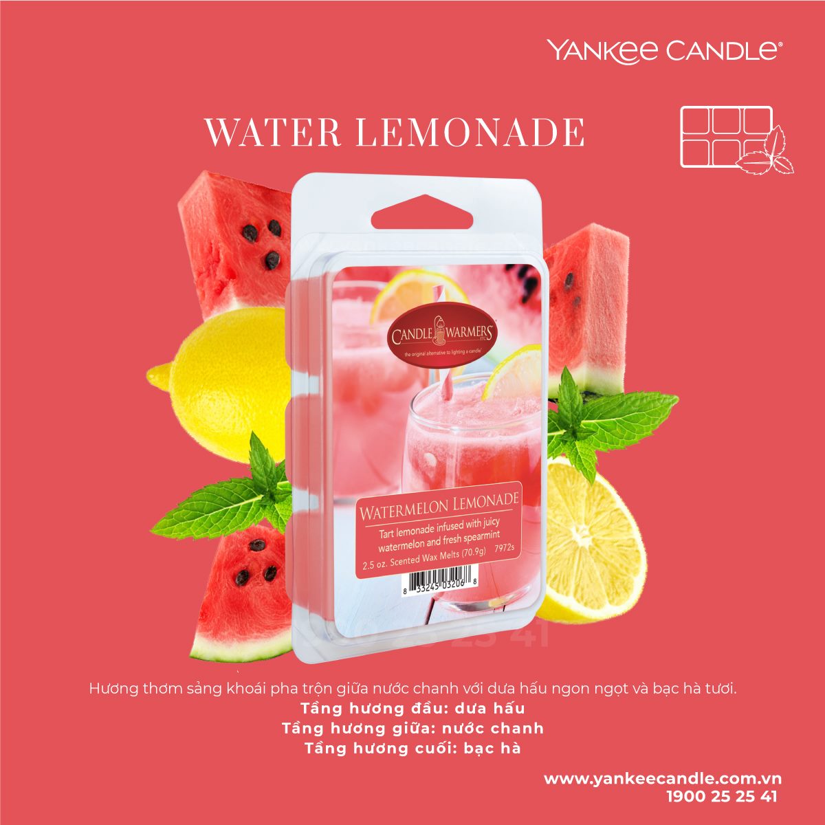 Water Lemonade: Hương thơm sảng khoái pha trộn giữa nước chanh với dưa hấu ngon ngọt và bạc hà tươi.