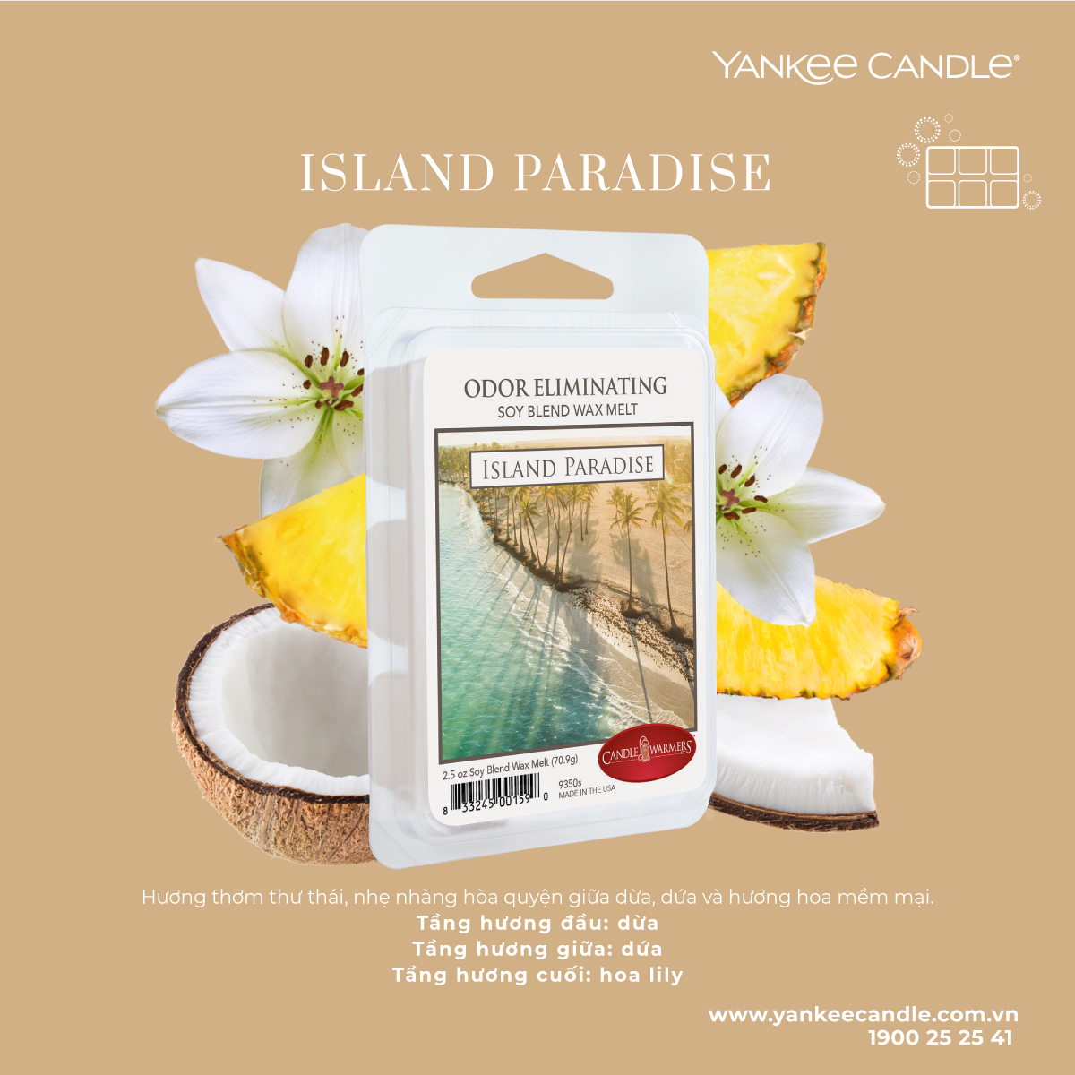 Island Paradise: Hương thơm thư thái, nhẹ nhàng hòa quyện giữa dừa, dứa và hương hoa mềm mại.