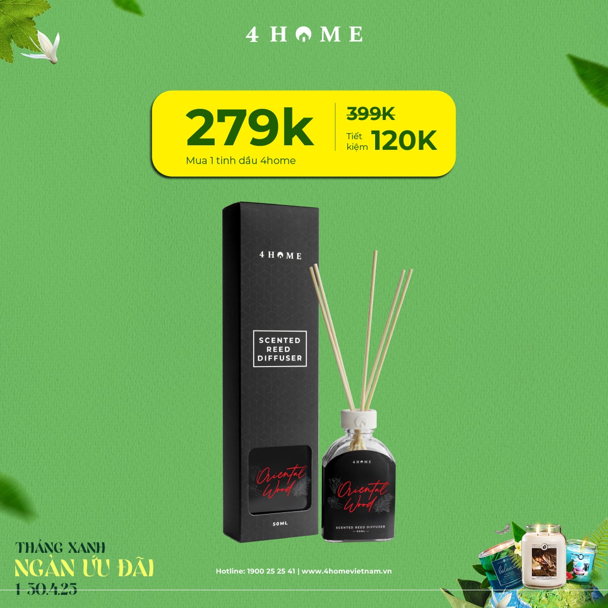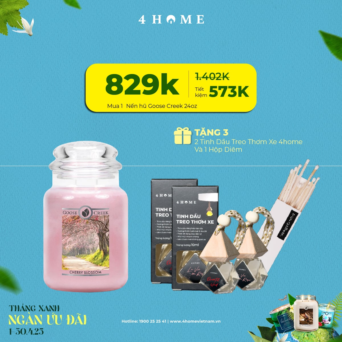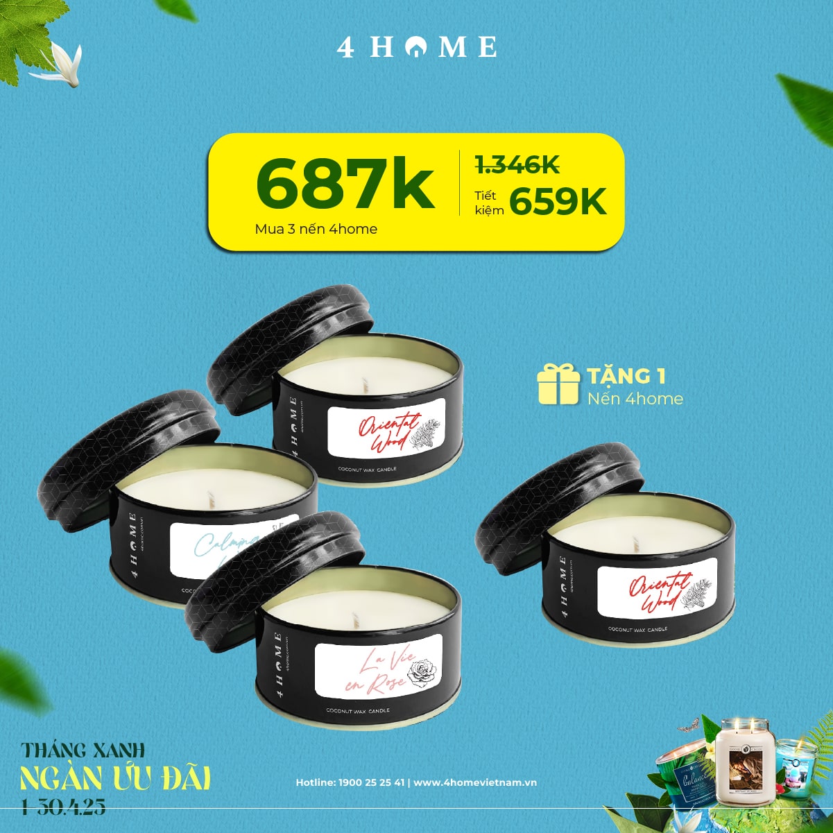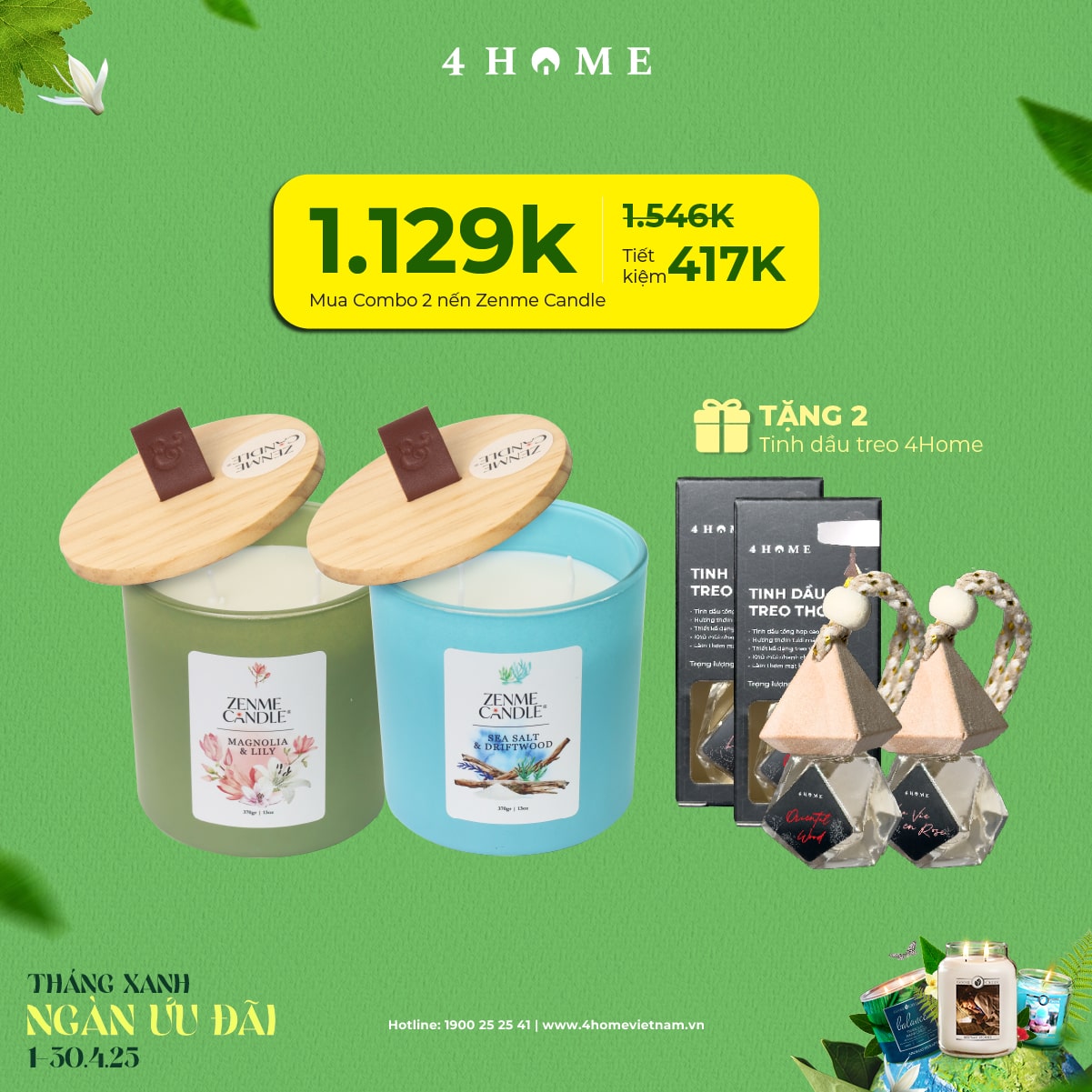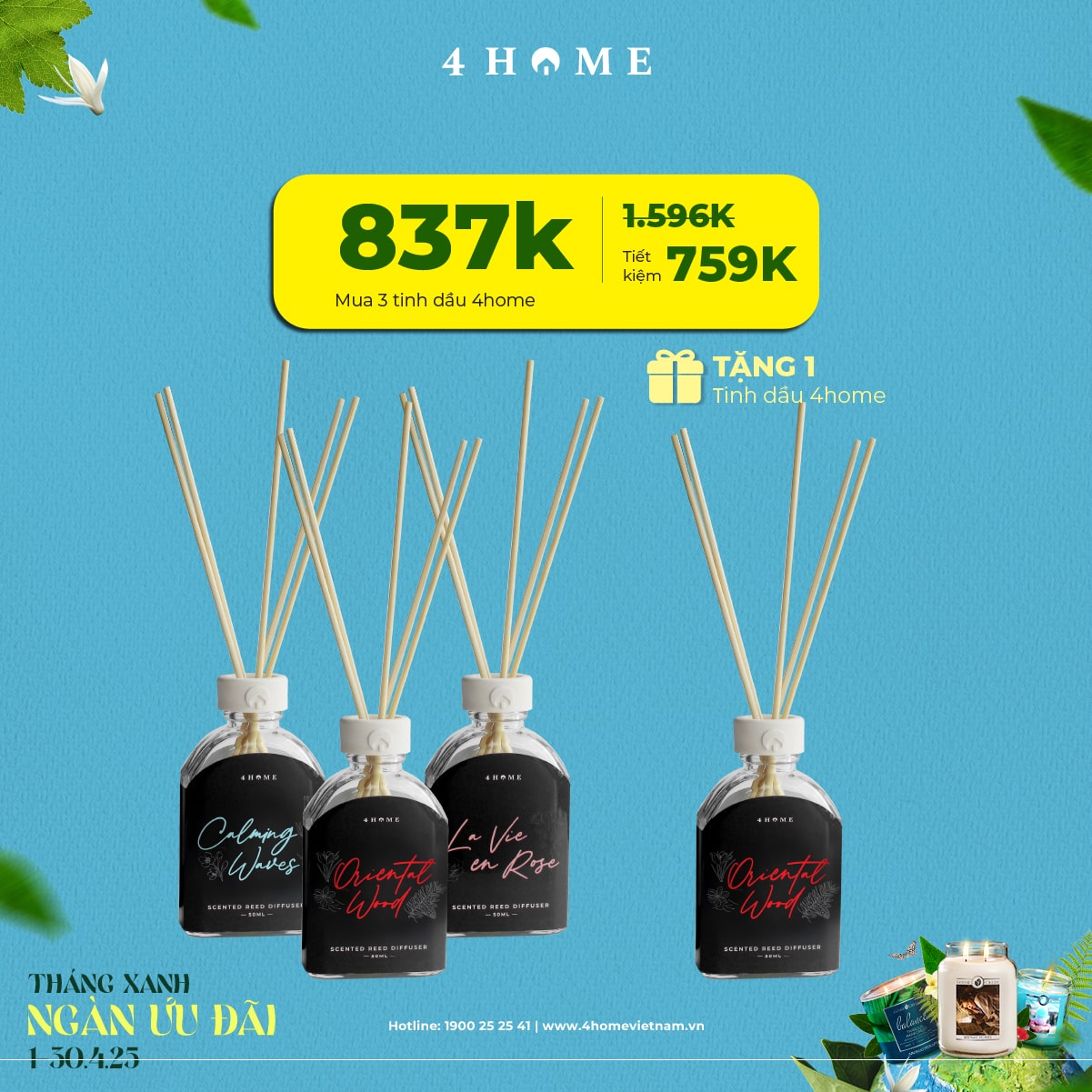 Cả rừng deal đang chờ bạn khám phá: từ nến thơm, tinh dầu, túi chườm thảo mộc, sản phẩm khử mùi chăm sóc không gian sống...Cùng 4Home biến tháng 4 thành một hành trình thư giãn với hương thơm xanh mát và ngập tràn ưu đãi bạn nha!